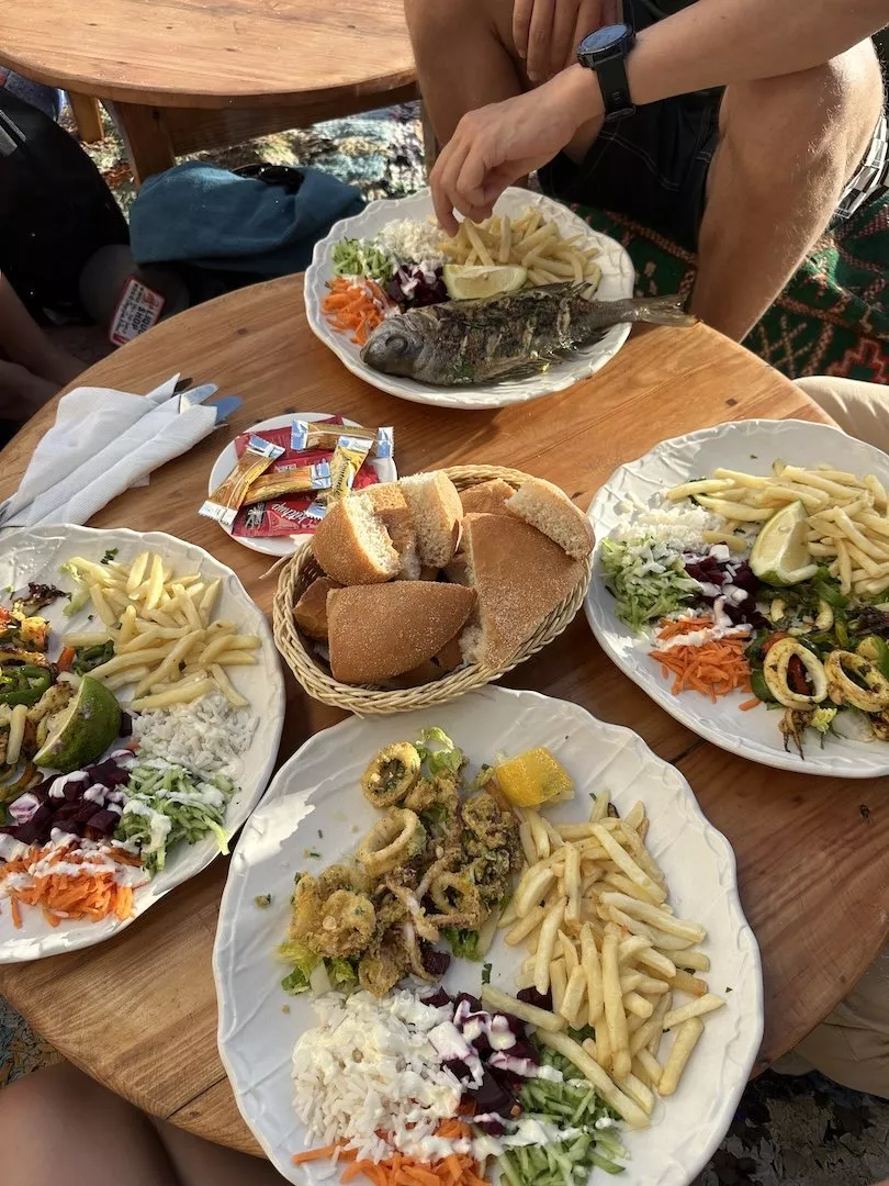 This spot I found when just exploring Taghazout because it’s not in the main part, you have to walk along the water a bit of the ways to find out. It’s such a cute location! It’s literally right on the cliffs of the water and there is an outdoor section on the cliffs overlooking the water. I mean, some of these tables are literally in a splash zone! Then there is another section to the side of the building where there’s lounge cushions and small tables for you to sit on the floor and relax, chatting and they do a fire at sunset. It’s such a beautiful location so I highly recommend you come here for a sunset dinner one evening. I had their fried calmari dish was soo good and friends had the fresh fish which they said was amazing!