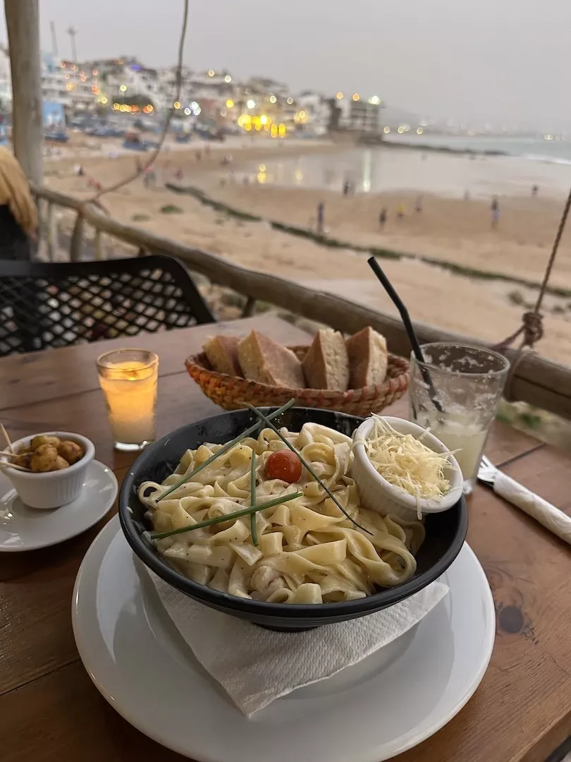 This spot is amazing, simply for it’s location. It’s a popular venue with seating literally right on the waterfront which is outdoor dining with a cover to keep the sun off you. There is also an in-door section with essentially no doors so you also can have a full view of the sea even if you’re sitting inside. This was a place I frequented almost daily to work and eat lunch or have a coffee or smoothie. The food is good especially with the view. I had the shrimp curry which actually was very delicious (my friend had the chicken version), really great sauce, as well as the chicken ceasar salad and seafood pasta. The prices here are high for Moroccan standards, so expect to pay 90-120 MAD for a dinner meal plus drink costs, etc.