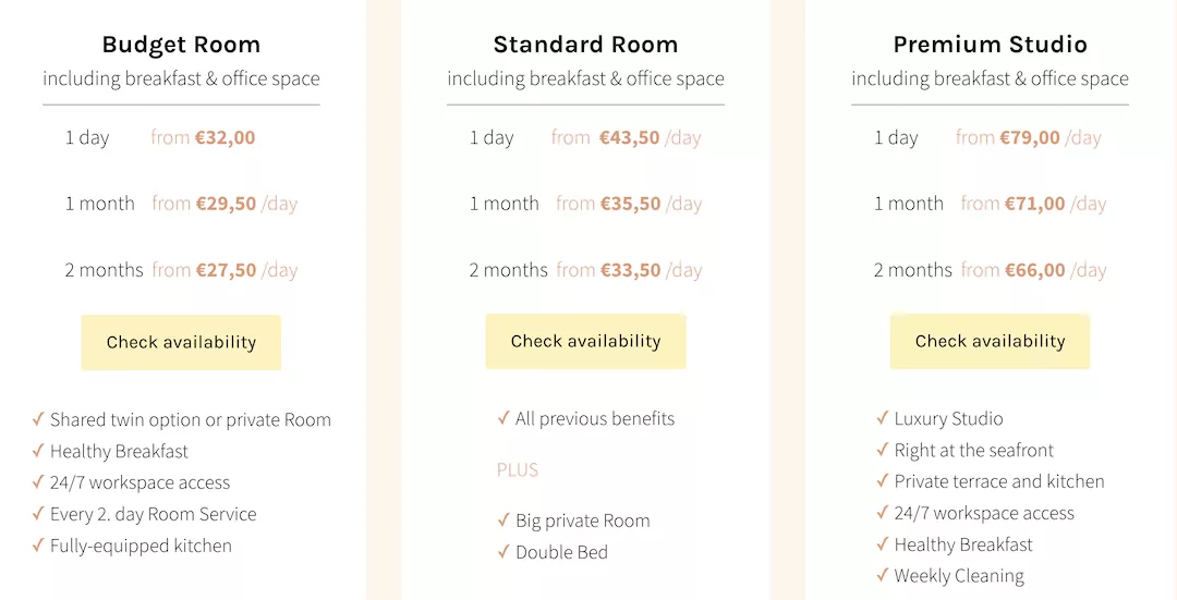 1. 1-week work and stay for 319 euros that includes access to the co-working space, 1 surf and yoga session, and 3x meals a day and a one-way airport transfer.